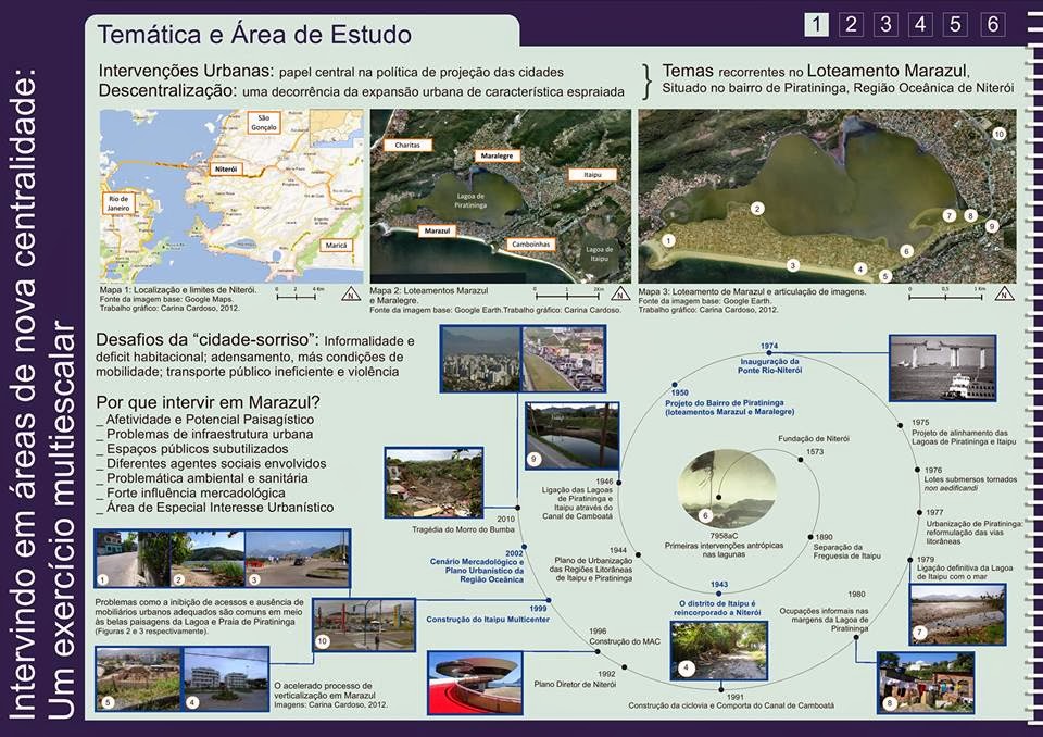 CARINA FOLENA - "A primeira ideia que tive sobre trabalhar uma intervenção urbana em Niterói no Trabalho Final de Graduação me ocorreu logo no segundo período do curso de Arquitetura e Urbanismo. Nessa época, eu trabalhava como bolsista de Iniciação Científica no extinto L.O.CI., sob a orientação do professor Antonio Colchete Filho, em uma pesquisa intitulada “Projetos de intervenção urbana na escala paisagística: a organização do espaço livre público (1980-2005)”. Este foi o meu primeiro contato com o urbanismo na graduação, e também um momento em que fui introduzida a importantes autores da área. Nós levantávamos projetos de intervenção urbana em vários continentes em um período de três décadas e analisávamos os que se mostravam paradigmáticos sob algum aspecto. Contudo o que chamava atenção era o grande número de projetos realizados em áreas de frente marítima, exatamente por ser o litoral um local de grande apelo paisagístico e valorizado em suas potencialidades de lazer e entretenimento.
